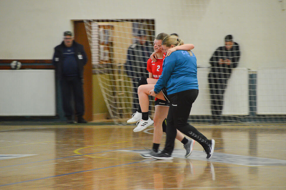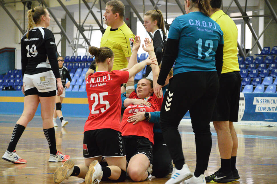 Viszont számukra is volt egy ijesztő jelenete a mérkőzésnek: Alexandra Pop maradt földön, miután Dénes Szidóniával ütközött, és a hangjából ítélve úgy tűnt, komoly a baj. Az ölükben kellett levinniük a stábtagoknak és a csapattársaknak, de a mérkőzés végén saját lábán bicegett be az öltözőbe. A találkozót végül 25-42 arányban nyerte meg Nagybánya.