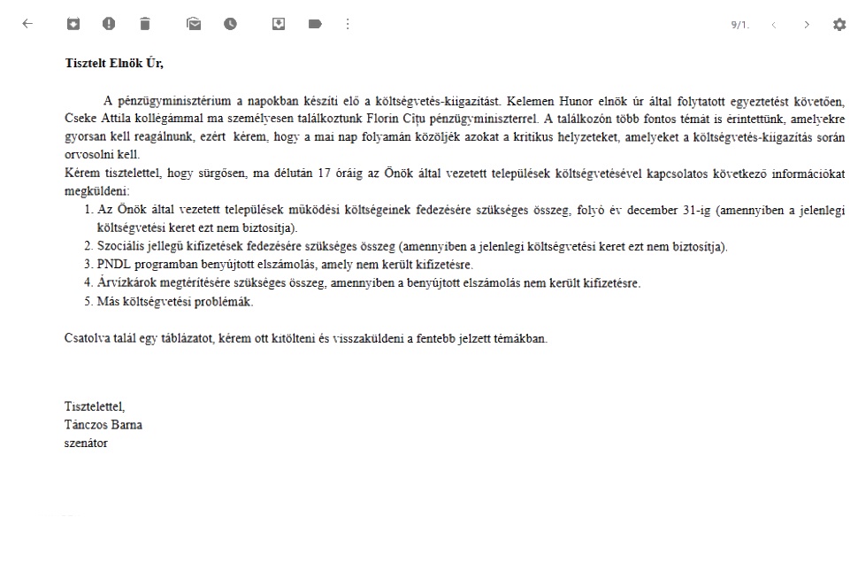 Hogy egy kis politikai színezete is volt a dolognak, abból látszik, hogy Tánczos Barna RMDSZ-es szenátor levelét is csatolták az e-mailhez, amelyben leírja, hogy Kelemen Hunorral, és Cseke Attilával hárman képviselték az RMDSZ-t a Florin Cîțu pénzügyminiszterrel való egyeztetésen, ahol többek között a költségvetés-kiigazításról tárgyaltak.