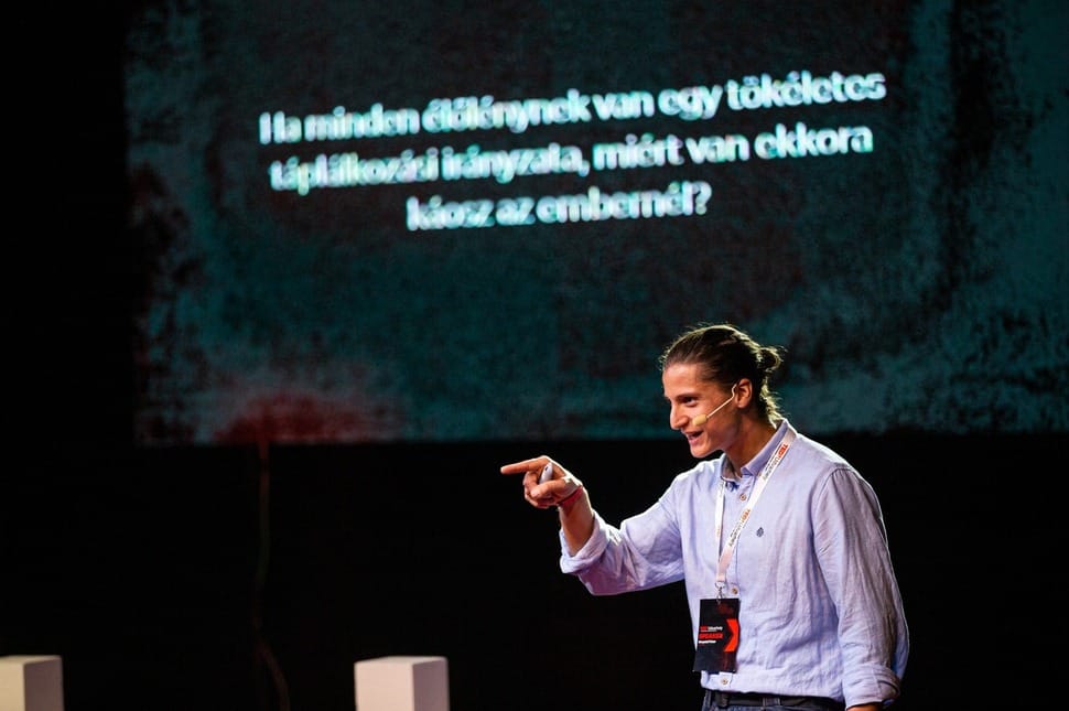 „Az vagy, amit megeszel”, konferálja fel Korpádi Pétert a színpadra Fincziski Andrea, miután meogsztja a közönséggel, hogy ő maga is évekkel ezelőtt az erőszakmentesség és a fenntarthatóság jegyében vegetáriánus lett, másfél éve pedig vegán, így nagyon örült, hogy Péter is előad az udvarhelyi TedX-en.