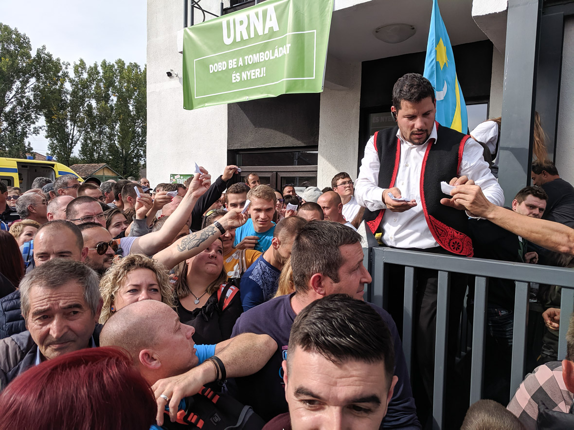 Hálával szívünkben álltunk be a jelentéktelen méretű kétórás sorba, mely egy kupakbeváltás és egy urnamegközelítő, test-a-testhez összemelegedős before-party után a gyárudvarba vezet, ahol többszörös választási lehetőség kedvezményezettjei lehetünk Lénárd András nemzeti hősünk fővédnöksége alatt. Ez már az új, demokratikusabb világ csírájának az első lenyomata.