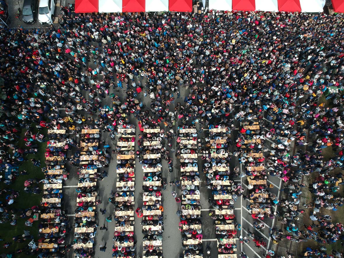Az új választás sikerét hivatott hirdetni ez a végeláthatatlan egybefüggő sor, mely már nem is csak egy sor, hanem inkább egy egybefüggő népakarat, mely összeköti, és teljesen kitölti az asztalok és a sörcsapok közötti teret. A választás szabadságát dicséri az a hozsánna-megnyilatkoztatás, miszerint minden szabad polgár választhat, hogy ezen élményszerű egyórás fullkontakt mérkőzés végén miben részesüljön: egy pohár nemzetközi visszhangú sikersörben, egy szép fényes, a népegészség érdekében parciálisan húsmentesített kolbászban, vagy egy szimbolikusan söröspohárba felszolgált fuszulykafőzelékben. Én a legutóbbira szavazok, és habár a sornak nevezett emberhalmaz kiállása után pontosan előttem fogy el az áhított anyag, mégis sikerül többedmagammal részesülnöm a szent fuszuly áldásából, mikor egy kifele úszó felebarátom megszán minket, és többünket is részesít agapéjából. A mellettem állónak több adatik, a mellére, nekem csak a nadrágom kap belőle, de mégis oly hálás vagyok, mintha az egész fejemet alámerítették volna az új világ keresztvizében.