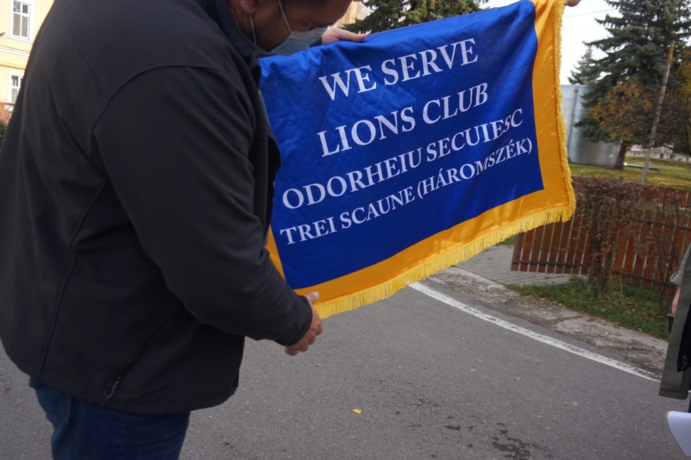 Már a legelején, a kórház udvarán az a meglepetés ért minket, hogy – kezükben a háromszéki-udvarhelyi Lions zászlójával – a csíkszeredai Tófalvi Éva biatlon-olimpikon fogadott Szécsi Mózes mellett, aki a belvárosi református egyházközség főgondnokaként lehet ismerős az udvarhelyiek számára.