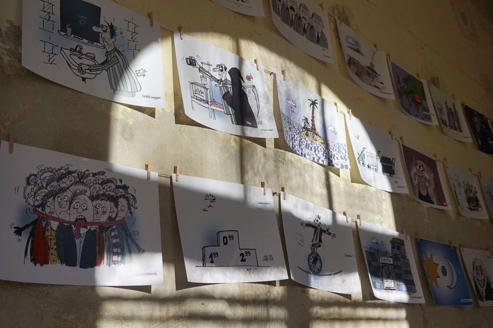 Az első emeleten Könczey Elemér korábban említett tárlatába botlunk, amit a körülményekhez igazított formában állítottak ki – csupasz falakon néhány zsinór, amin csiptetők tartják az egyszerű kartonlapra nyomtatott karikatúrákat. Minek is elbonyolítani, épp elég fejfájást okoz a teljes felfordulás! Ez ilyen, az évfordulókat nem lehet csak úgy elnapolni.