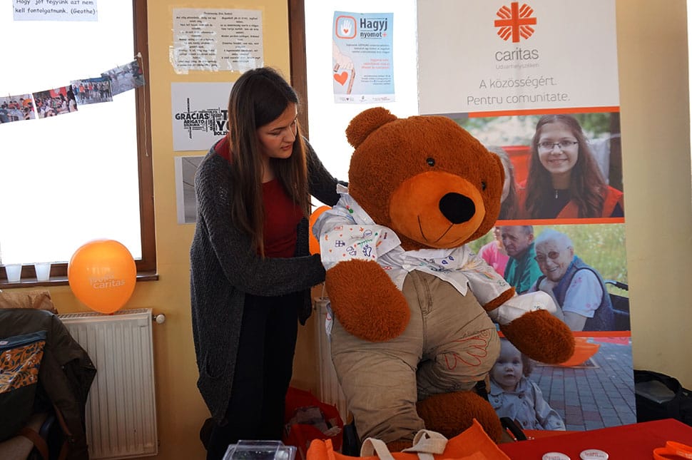 A Gyulafehérvári Caritas Ödönnel, az óriás plüssmackóval érkezett, aki az önkénteskedés kabalafigurája, na őt tényleg simogatni kell. A szervezet “élő példákat” is hozott, hiszen olyan fiatalok álltak a stand mellett, akik évek óta tagjai az önkéntescsapatnak, és elmondásuk szerint nem is tervezik abbahagyni a jótékony munkát, mert általa hasznosnak érzik magukat, és nem mellesleg jó társaságban vannak, az önkénteskuckó már olyan, mint egy második otthon – vallják.