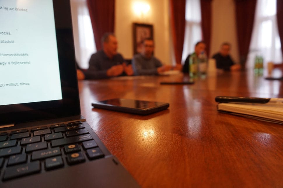 Az asztal túlsó oldalán a városmenedzser mellett ülnek (képünkön, balról jobbra): Fülöp Árpád Zoltán főkönyvelő, aki mellesleg egyetemi oktató és csíkszeredai helyi tanácsos, Bogáti Csaba Harvíz-igazgató, valamint Izsák Attila udvarhelyi munkapont-vezető, akinek alkalmazása kapcsán megjegyezték: ragaszkodtak hozzá, hogy helyi ember legyen, szakember legyen, és örülnek, hogy személyében sikerült ilyet találni.