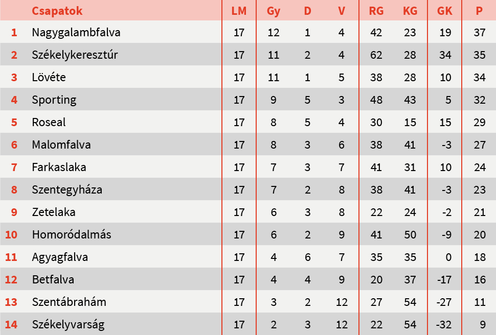 Idegenben szerzett győzelmének köszönhetően Nagygalambfalva továbbra is vezeti a megyei bajnokság Nyugati-csoportját. Szorosan ott van a nyomában Székelykeresztúr, aki hétvégén hat pontot szerzett. A szombati játéknapon a Székelyudvarhelyi Sportingot győzték le, majd vasárnap a 14-ik fordulóból elhalasztott Szentegyháza elleni találkozón szerezték meg a pontokat a keresztúriak. A tabella harmadik fokán Lövéte áll.