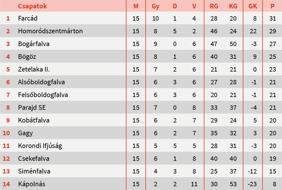 Az 5. Liga udvarhelyi csoportjában hazai pályán kapott ki az éllovas Farcád a homoródszentmártoniaktól. A vereség ellenére a farcádiak elsősége megmaradt, de előnyük már csak két pont a vasárnapi legyőzőjükkel szemben. A forduló előtt még a második helyen álló Bogárfalva Gagyban hagyta a pontokat, így egy helyet hátracsúszott a tabellán. A harmadik pozícióból várhatják a következő játéknapot.