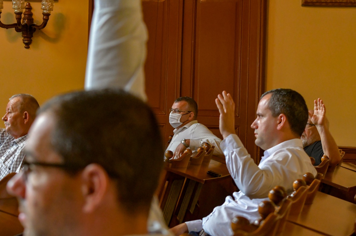 Először találkoztak élőben a tanácsosok a járvány kezdetén tartott rendkívüli tanácsülés óta. A Szent István teremben távolságtartással foglaltak helyet a képviselők, közülük is csupán tizenöten, így jól elfértek a teremben. A maszkok nem foglalták nagyon a helyet, főleg nem az arcokon.