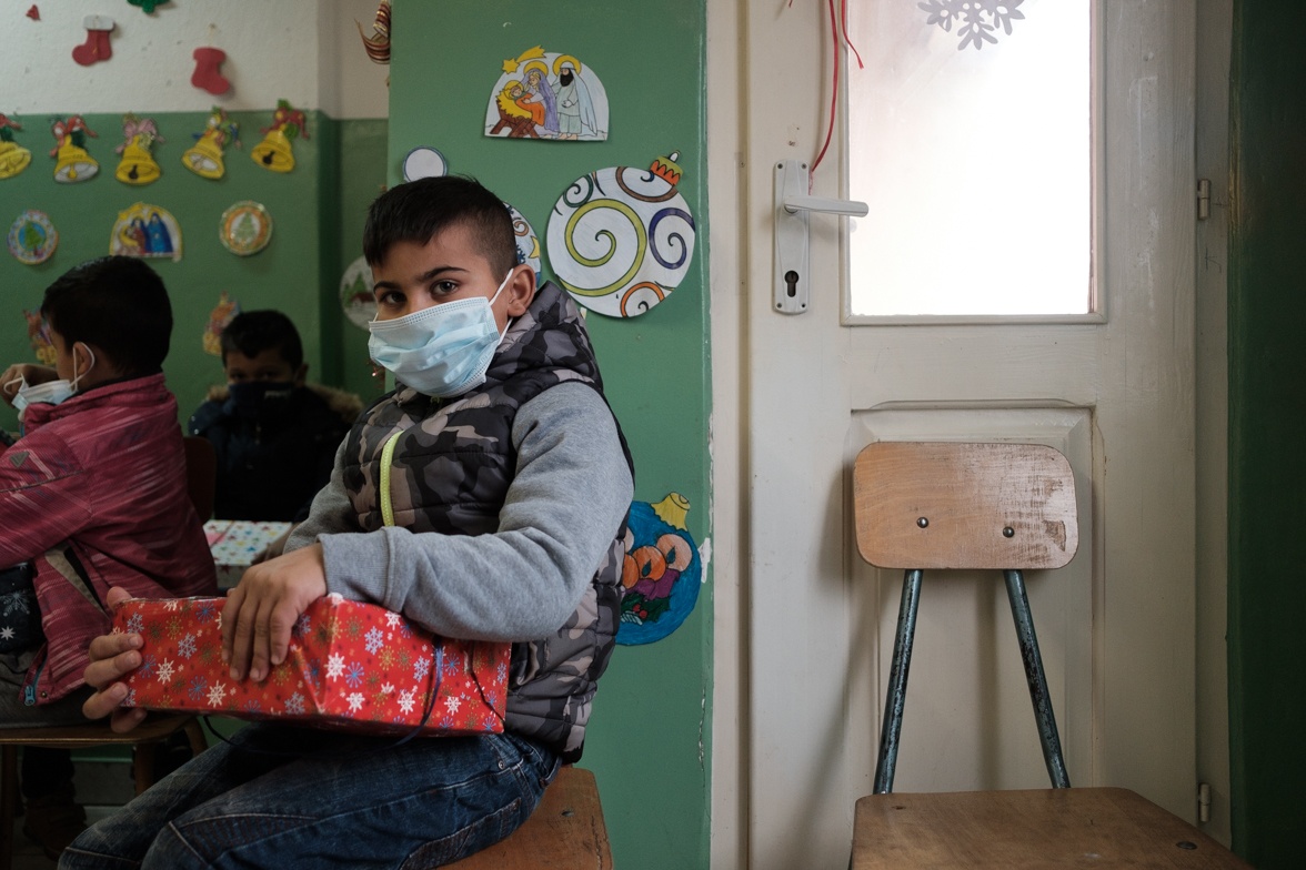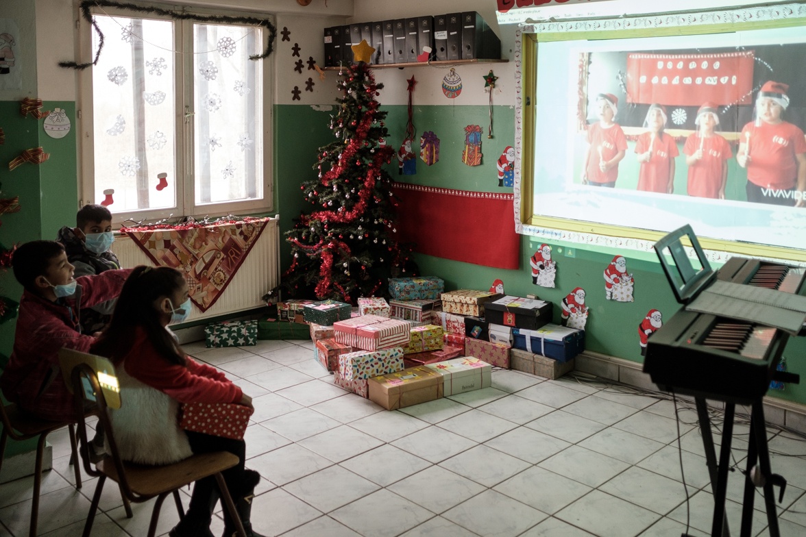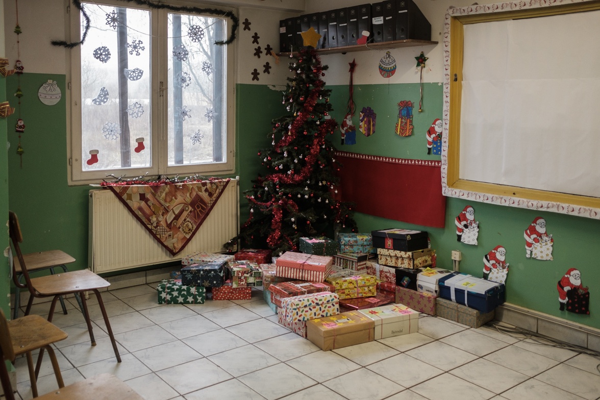 A csomagok már a karácsonyfa alatt várják, hogy gazdára találjanak, de szigorúan csak hétfős csoportokban jöhetnek értük a gyerekek, mert Arafat bácsi még az angyalnak is dirigál.