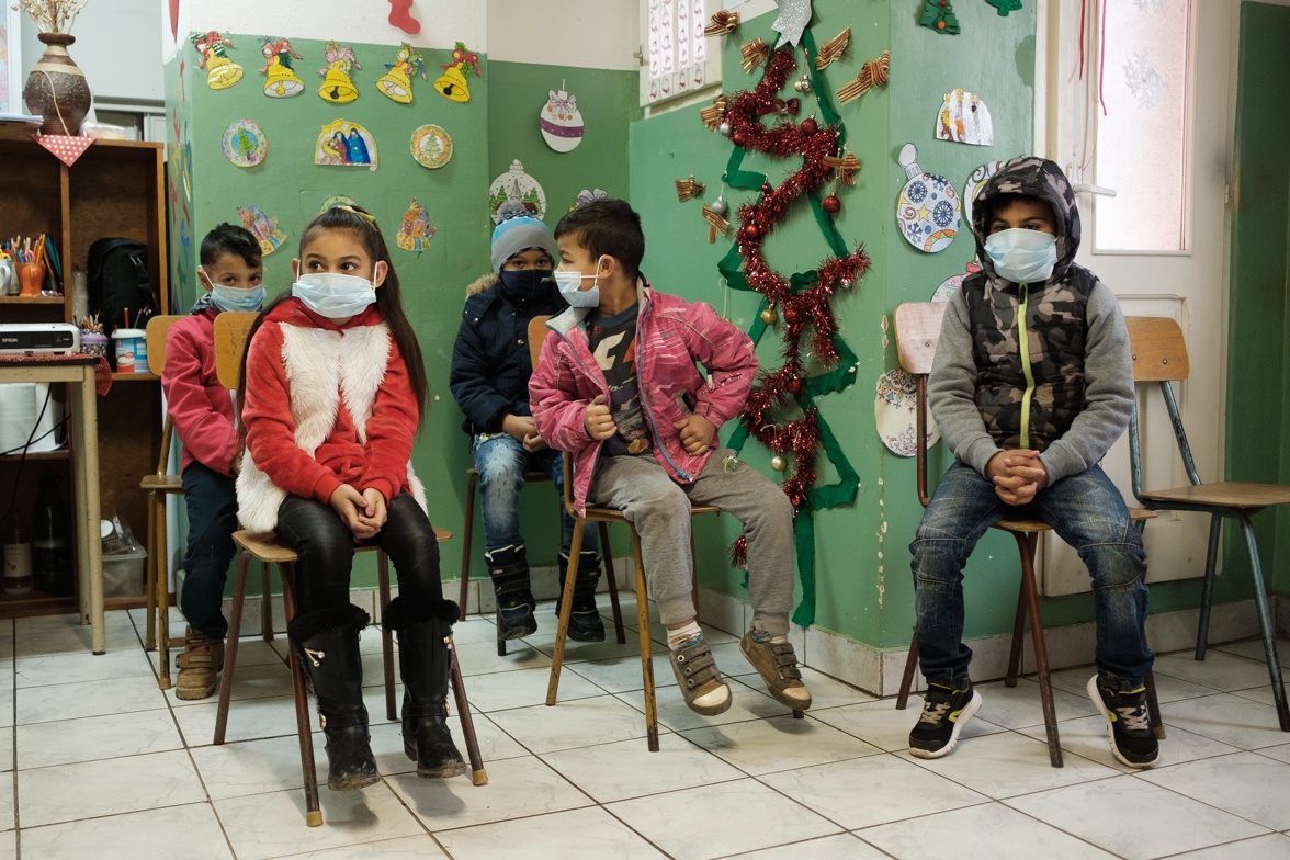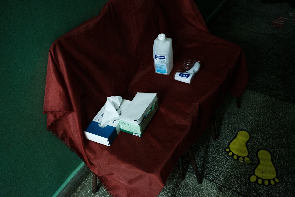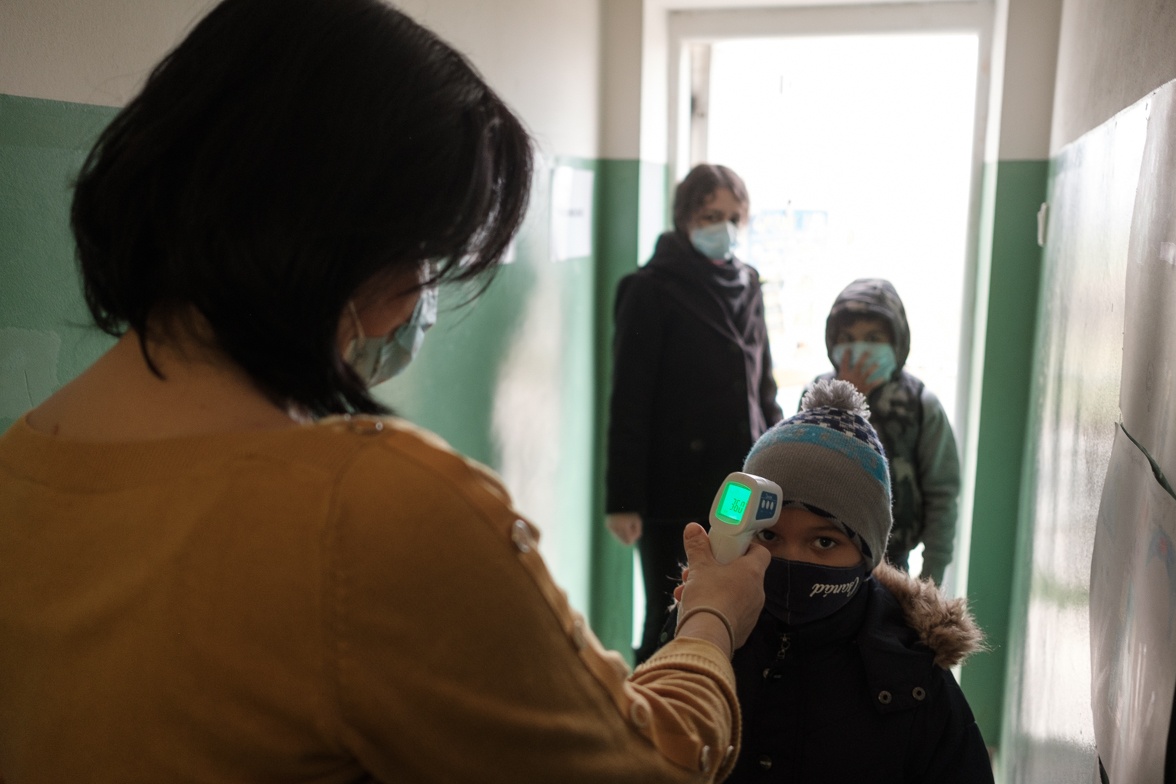 Meglehetősen csendesen, fegyelmezett csapatban jönnek be a gyerekek. Maszkban, az előírásoknak eleget téve fertőtlenítik a kezüket maszkban, majd jöhet egy maszkos lázmérés, és persze, mindenki helyet foglal a teremben – maszkban.