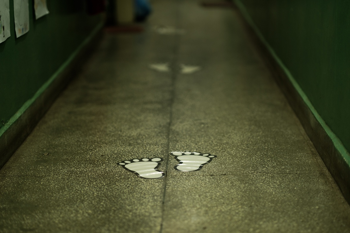 A folyosón is mindenkinek be kell tartania a kellő távolságot, erre itt vannak ezek a lábnyomok, bár könnyen megeshet, hogy a szomszédos festékes üzletben járt az angyal előző este.