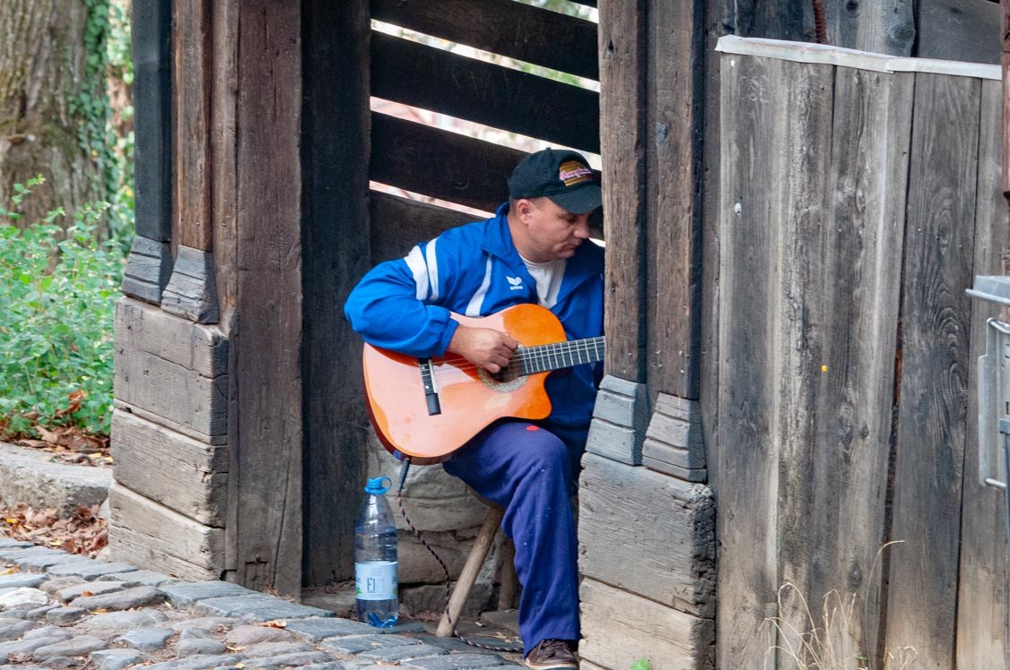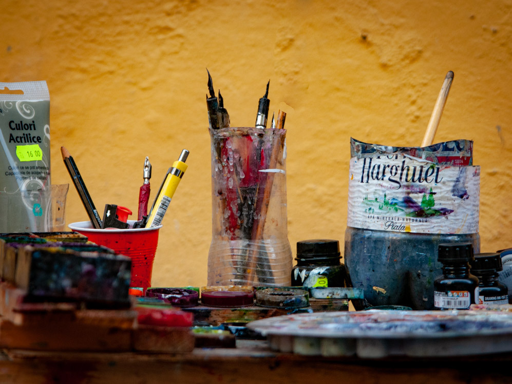 Pár sarokkal tovább, fellelhető egy művész is. A mester házon kívül vagy belül, csak a munkaasztala maradt itt.
