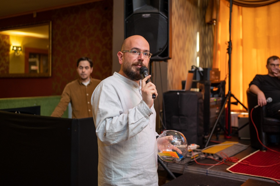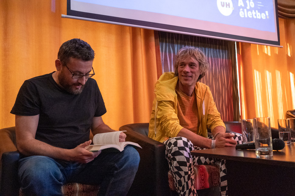 A beszélgetés alatt remek hangulat van a teremben, egyre több a résztvevő, ahogyan a színes cédulákra írt nézői kérdések is, a feltevőik közül öten nemcsak választ, hanem egyéves uh.ro-előfizetést is kapnak, magyarázza Szasza.