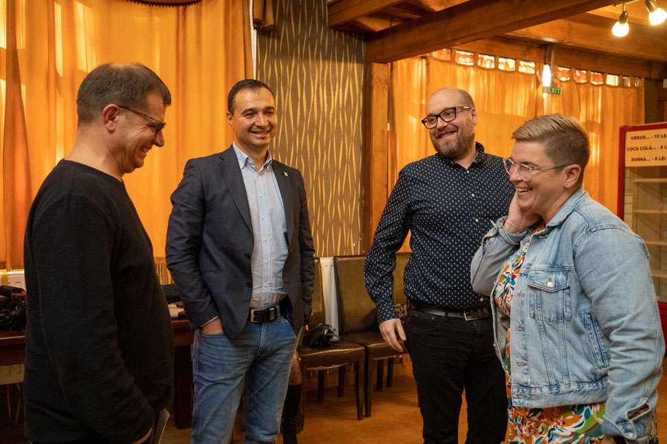 Új kolléganőnk, Kovács Bea is felszólal egy példával, beleolvas Kelemen Hunor egy októberi posztjába a Marosvásárhelyi Műveszeti Egyetem megnyitójáról. Az RMDSZ számára fontos az intézmény, és azt kívánja, hogy a sokoldalú művészeti képzés békés szigete legyen az, ami meg tudja őrizni az önállóságát. Mindeközben az RMDSZ kezében lévő Communitas Alapítvány a kiszolgáltatott anyagi helyzetben lévő fiatal művészeket támogatja egy bizonyos összeggel havonta, „ezért nincs szerintem Erdélyben igazi politikai színház, ami nem csak arról szól, hogy a hatalom az gonosz”, magyarázza Bea. Közben sokan bólogatnak, hümmögnek, meglepettek, szinte lélegzetvételt sem hallani, mindenki annyira figyel.