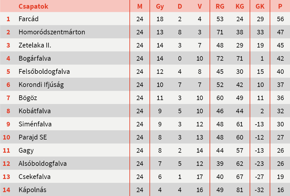 Az 5. Ligában szintén bajnokot avattak a hét végén. Farcád hazai pályán győzte le Bogárfalvát, és behozhatatlan előnyre tett szert. A csoport további két dobogós helyéért az utolsó két fordulóban Homoródszentmárton, Zetelaka II. és Bogárfalva maradt harcban. Matematikai esélye azonban Felsőboldogfalvának is van, még elcsípheti a harmadik helyet.