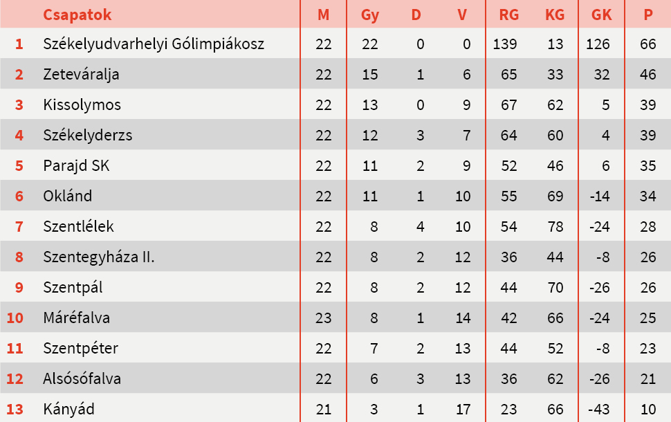 A tabella második helyén Zeteváralja áll. A dobogó harmadik fokára a kissolymosiak léptek fel úgy, hogy az elmúlt fordulóban szabadnaposak voltak. Mivel Székelyderzs nem jelent meg Szentpéteren, így a derzsiek gólaránya csökkent, a kissolymosiaknak ez épp elég volt arra, hogy a harmadik pozícióból várhassák a következő játéknapot.