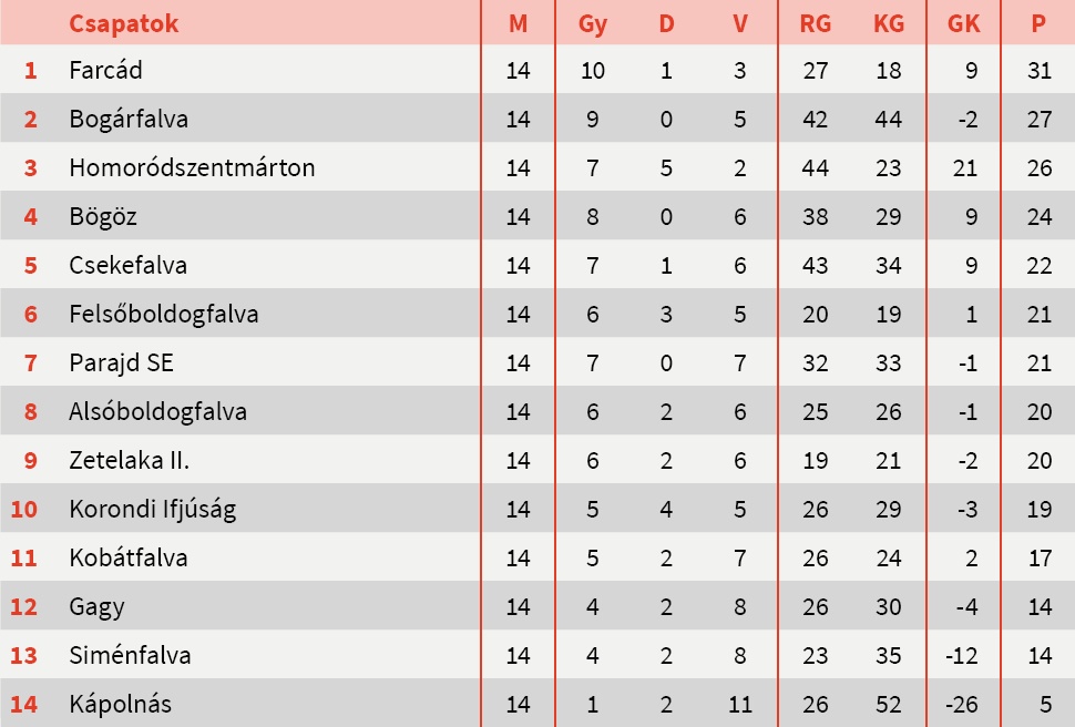 Az 5. Liga udvarhelyi csoportjában nem történt változás a tabella élén. A listavezető Farcád 1-1-es döntetlent játszott Zetelakán, ám vezető helyüket a két pont elvesztése nem veszélyeztette. A dobogó második és harmadik fokán Bogárfalva, illetve Homoródszentmárton állnak.