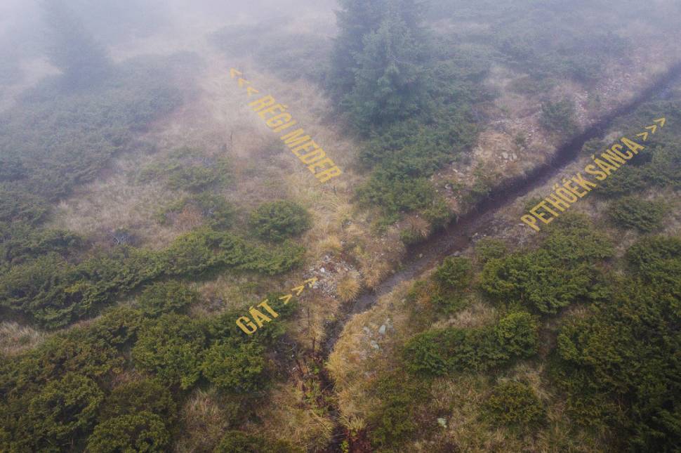 A helyszínen látottak arra utalnak, hogy nem természetes eredetű a sánc, a 2015 előtti felvételeken nem is látszik, a Google Maps műholdfelvételein csak 2017 után kezd látványos lenni. Ebből arra a következtetésre jut a szerző, hogy valamikor 5-6 évvvel ezelőtt áshatták, és a patak eredeti medrétől terelték el a vizet, ami a tőzeglápot táplálja.