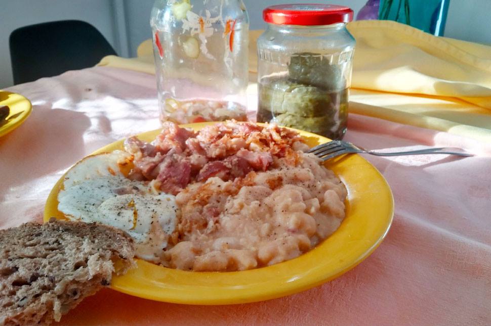 “Ez volt a reggelim a minap, egy kis tükörtojással megspékelve. Magyaros bablevesnek indult, de sikerült túlméretezni az adagot, alig győztem adagolni hozzá a vizet. Amennyit felvesz, ugye, így szokták mondani. Nos, mind felvette s még annál is többet. Így lett belőle jó román étel.