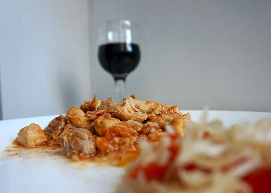 Hogy még véletlenül se edződjön meg a hús, bár a csirke nem nagyon szokott, előre kiolvasztottam a fagyasztott paradicsomot forró vízben, és egy kis házi paradicsomlé társaságában hozzáöntöttem, babérlevél és karikára vágott fokhagyma került még a fazékba. A végén kevés szárított csombort dobtam bele, csak annyit, hogy nehogy megkeseredjen az étel.