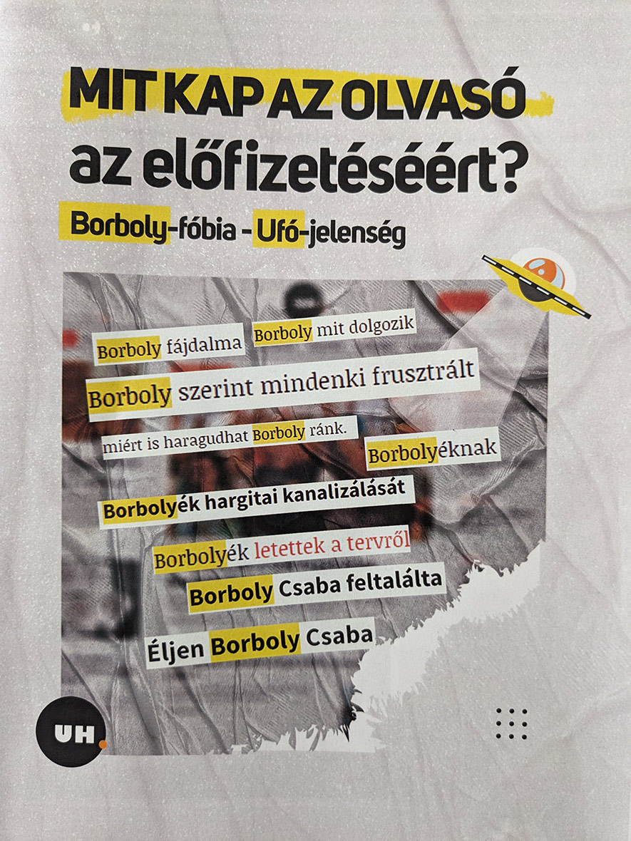 Ebben a könyvecskében a megyei tanács azt kifogásolja, hogy az uh.ro keresőjébe a Borboly szót beleírva 136 találat jön ki. Ezt Borboly-fóbia Ufó-jelenségnek nevezi. Az nem derül ki, hogy pontosan mi a baja, soknak vagy kevésnek tartja ezt a 136-ot. Hogy az a Borboly-fóbia, hogy sokat írtunk róla, vagy az, hogy keveset. Ahhoz képest, hogy ő a megye legszereplősebb politikusa, és naponta többször is bohóckodik élőben a Facebook-on és a TikTok-on, szerintem nagyon kicsi ez a szám.