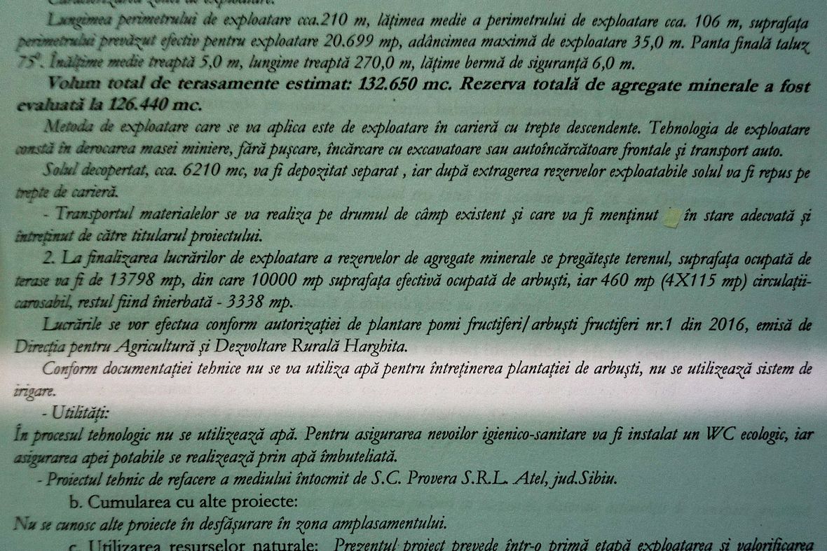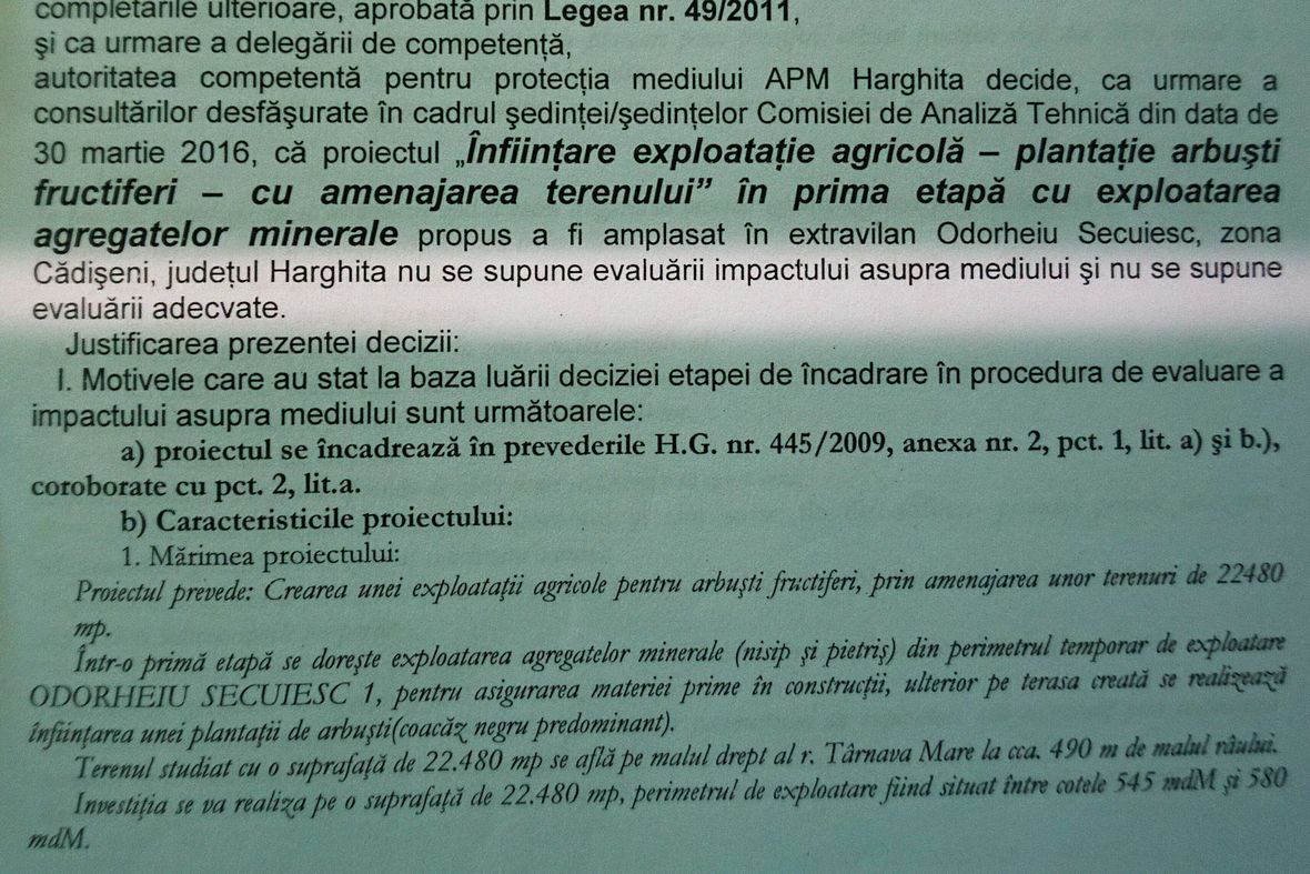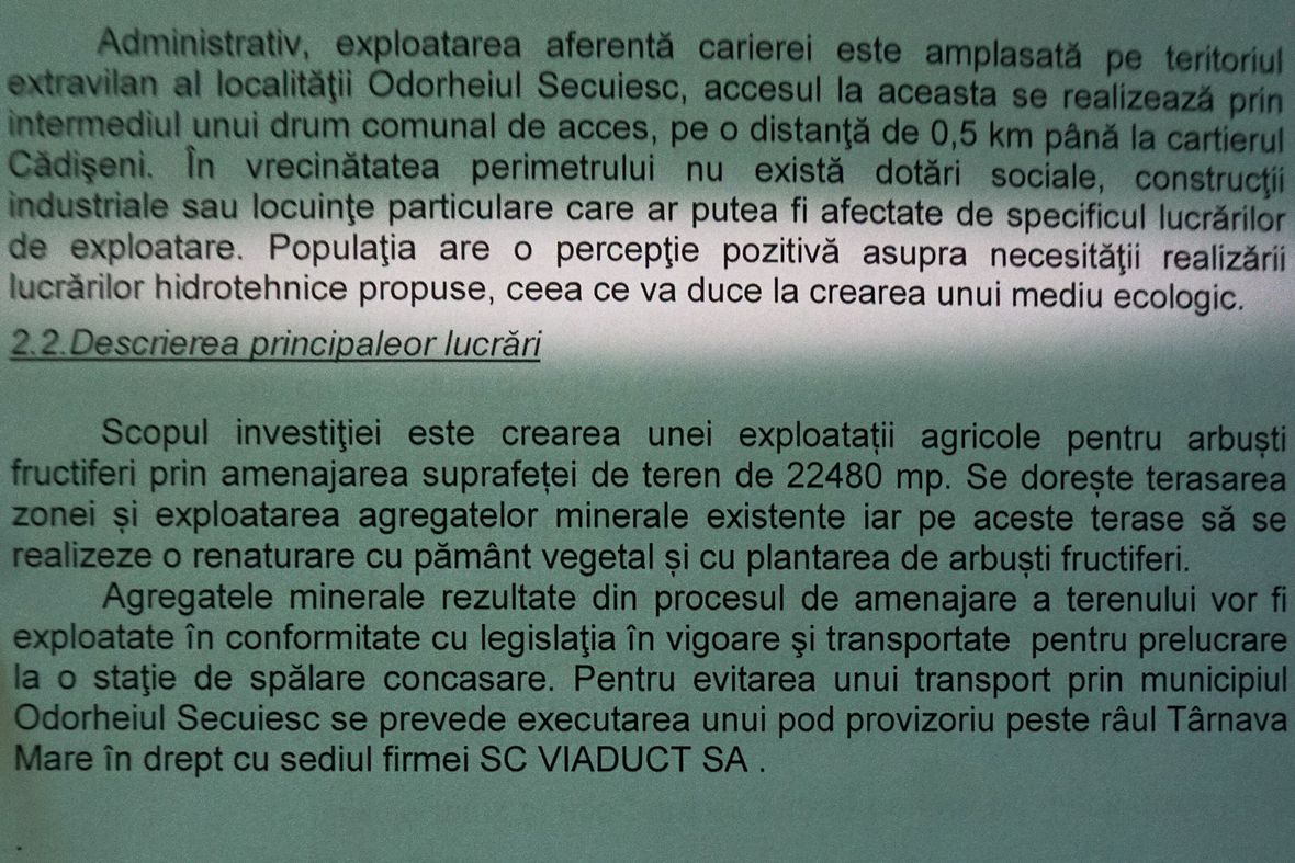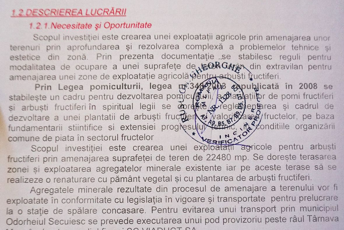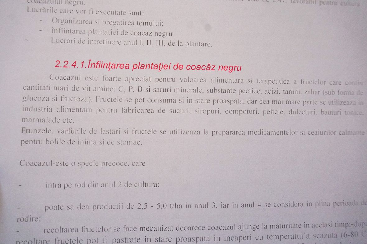 A második bekezdésben ilyen szavak fordulnak elő, hogy „spiritual”, vagy ilyen szókapcsolatok, hogy „pe baza fundamentarii stiintifice si extensiei progresului tehnic”, de ne ijedjen meg senki, nem lesz semmi spirituális a dologban, földhözragadt nyomorúság lesz csak, s a ribizlitermesztés tudományos megalapozottsága, illetve a technikai haladás kiterjedésének a magasfoka is látható lesz, amint megnézzük, mennyire érdektelenül kezelik a gyümölcstermesztős részt. A harmadik bekezdésben találunk egy mondatot, ami kiemelve a kontextusából, nagyon őszintének hangzik: „Se doreste terasarea zonei si exploatarea agregatelor minerale existente, iar pe aceste terase sa se realizeze o renaturare cu pamant vegetal si cu plantarea de arbusti fructiferi.”