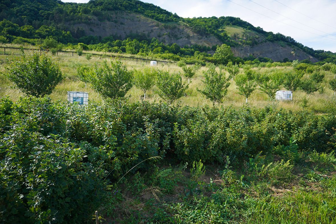 A közelben, pár száz méterrel odébb van még egy gyümölcsös, melyben van néhány ribizlisor is, de ez mélyebben van a völgyben, jobb a talaja, nincs annyira kitéve a napsütésnek, jobb vízellátottságú helyen van, s még így is fehér hordók hirdetik, itt vizet is adnak a növényeknek, nem mint odafent, a ribizlikínzóknál. Nyilván, ezt a gyümölcsöst nem azért ültették, hogy kitermelhessék alóla az altalajt.