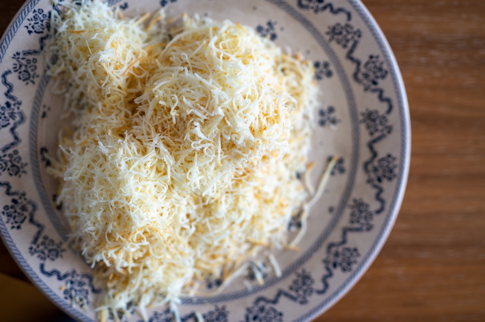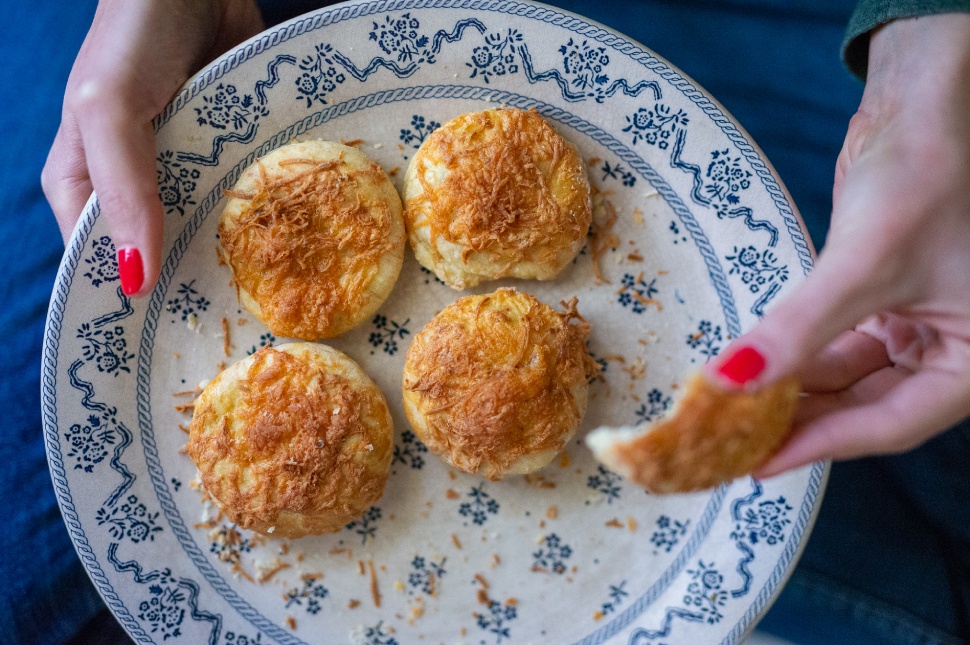 1,5 – 2 cm vastagságúra nyújtsuk, majd szaggassuk ki. A tetejét kenjük meg a tejes tojássárgájával és szórjuk meg reszelt sajttal.
