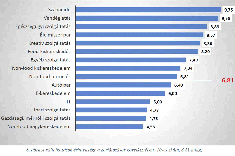 csupán 17 százalék mondta azt, hogy elhanyagolható mértékben. Egynegyedének be kellett zárnia, 44%-a visszaesést tapasztalt a bevételben, amely átlagosan a felére esett áprilisban és májusban. Elsősorban a társadalmi távolságtartás miatt leállt vendéglátóhelyeket, sporttermeket és más szabadidős szolgáltatókat, a fogorvosokat, a személyszállítókat és a szépségiparban dolgozókat érintette átlagosan 90–100%-ban.