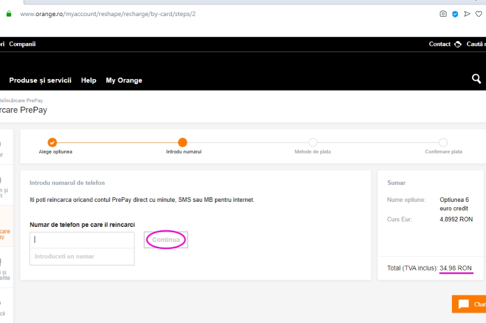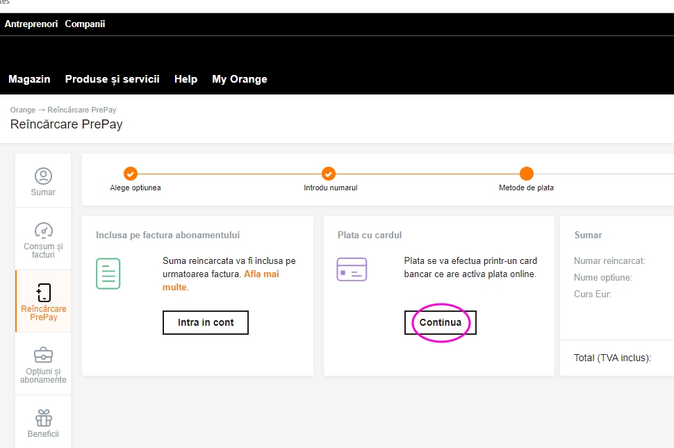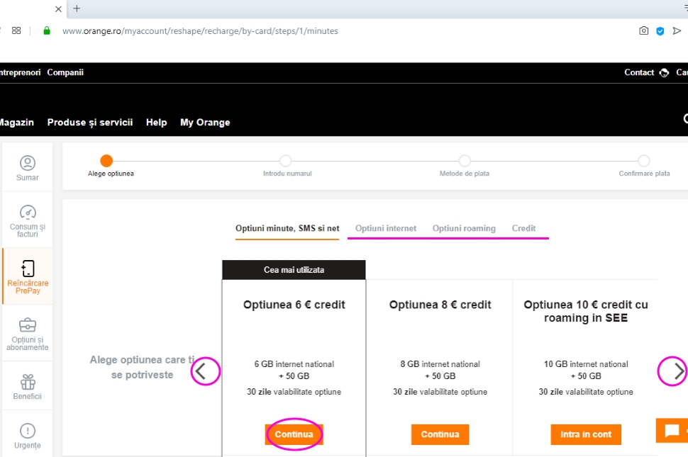 Ha erre klikkelsz, az alábbi oldal fog megjelenni, ahol először azt kell kiválasztanod, mivel szeretnéd feltölteni a kártyát. Az opciók közül tovább válogathatsz, ha a bekarikázott nyilakat használod, illetve lennebb tekerve láthatod minden opció további részleteit. A rózsaszínnel aláhúzott gombok is egyéb lehetőségeket nyújtanak a feltöltésre, bátorítunk, hogy ezeket is kattogtasd végig, hogy biztosan olyan opciót válassz, amit szeretnél. Ha meghoztad döntésed, kattints a kiválasztott opciódnál található Continuă gombra.