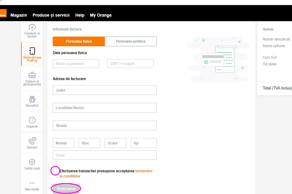 Ezt a részt töltsük ki a kért adatokkal, jelöljük be a körrel jelzett részt, miszerint elfogadjuk a felhasználási feltételeket, majd lépjünk tovább a Reîncarcă gombbal.