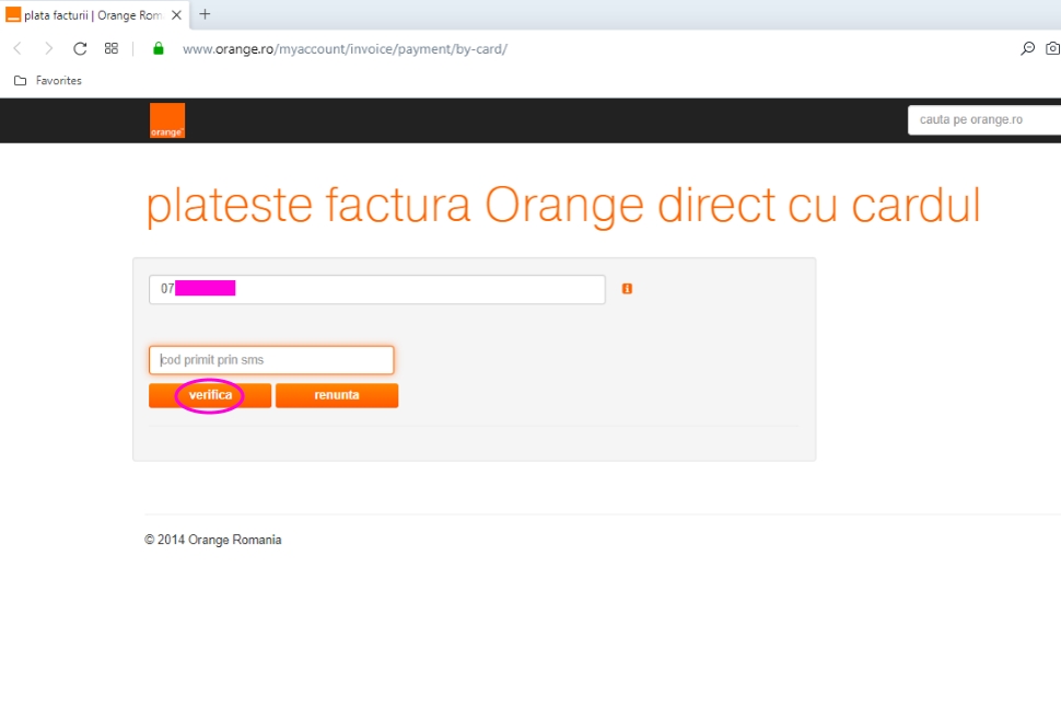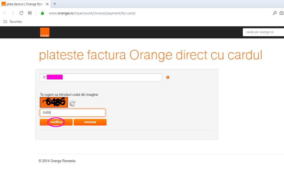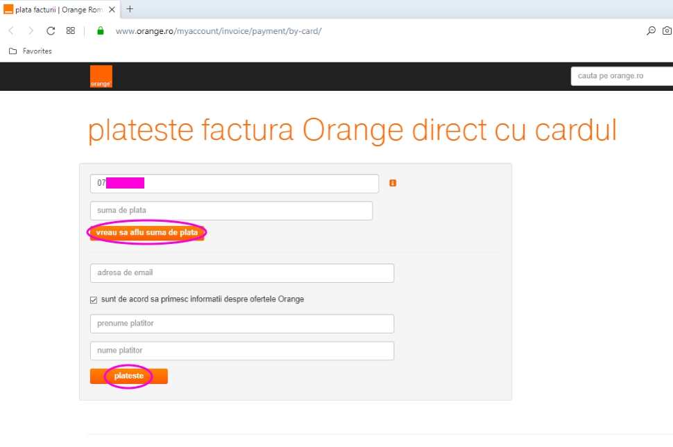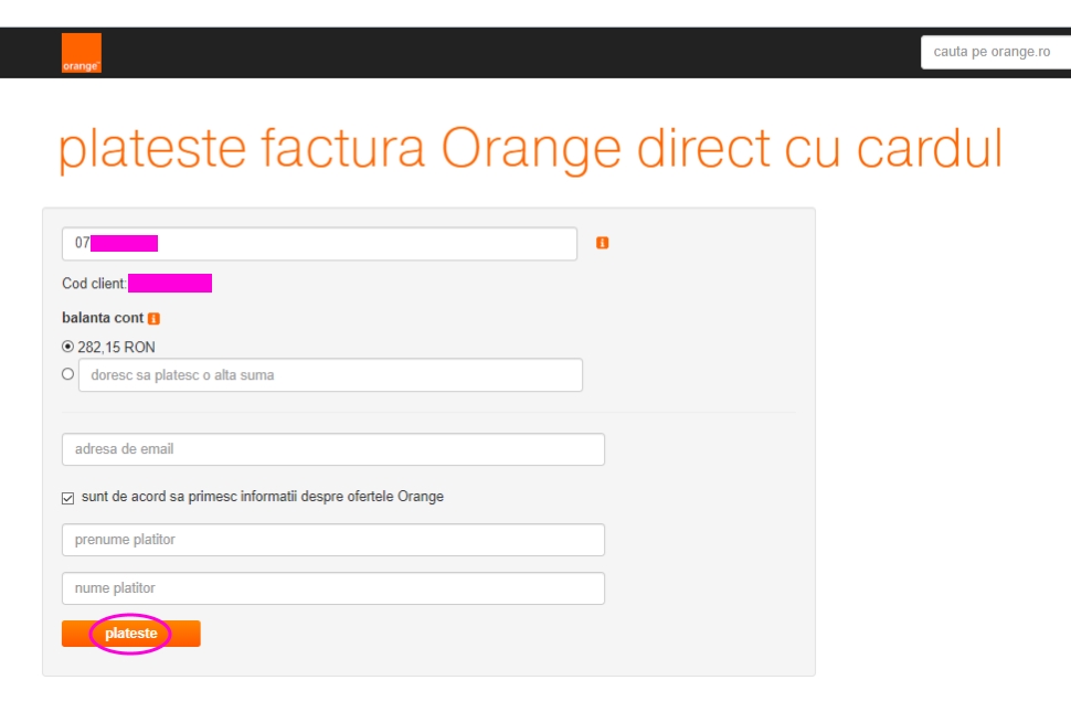 Ezen az oldalon elsőként azt a telefonszámot kell megadnunk, amelyhez tartozó számlát szeretnénk fizetni. Ekkor jelenik meg az ablak, ahova a fizetendő összeget kell beírnunk. Ha te tudod, mennyit kell befizetned, akkor írd be még a kereszt- és családneved, majd a lenti Plătește gombot nyomd meg, és ugorj az utolsó lépéshez.
