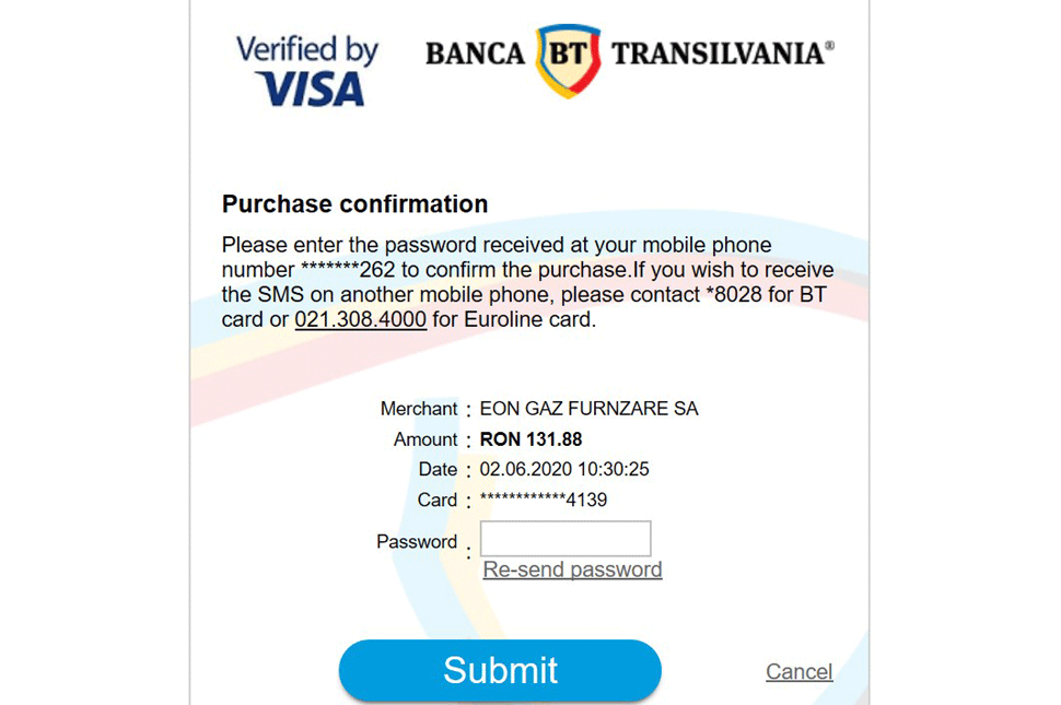 - A banki beállításaidtól függően kaphatsz SMS-ben egy kódot, amit az előugró ablakba kell bemásolni. A Transilvania banknál ez így néz ki.