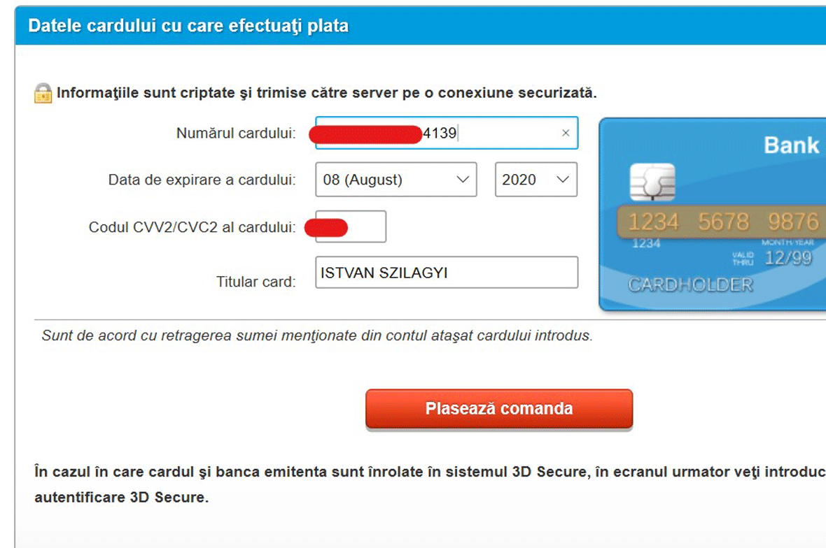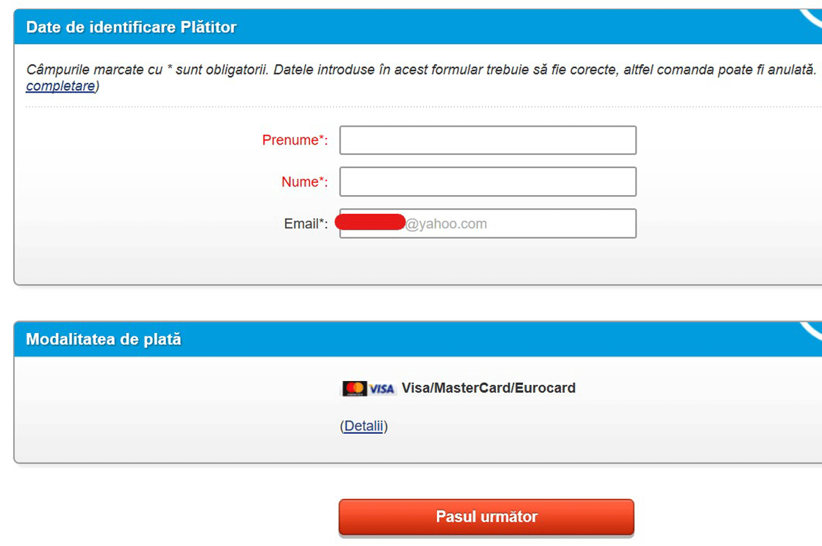 A következő lépés már a kártyás fizetés. Kattints a narancssárga mezőre (Pasul urmator).