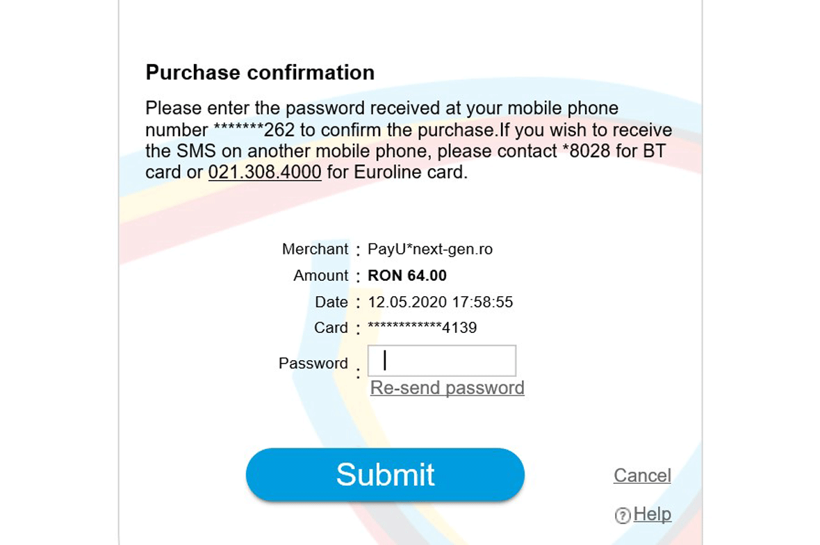 5. A banki beállításoktól függően megjelenhet még egy utolsó ablak, amiben a kártyatulajdonos telefonszámára küldenek egy kódot sms-ben. Ezt üsd be az üres mezőbe. A Banca Transilvania banknál ez így néz ki.