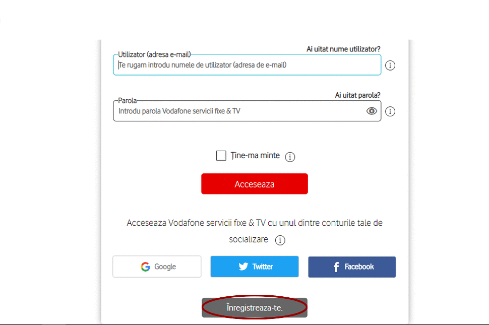 Ha az egyszerűbb utat választanád, akkor bejelentkezhetsz a Google-, Twitter-, vagy a Facebook-fiókoddal is. Ha pedig ragaszkodsz a hagyományokhoz, vagy nem rendelkezel ezek közül egyikkel sem, akkor kattints az Înregistrează-te gombra (mi ezt a verziót követjük, amennyiben te az elsőt választottad, akkor görgess lennebb: sejtéseink szerint tőled legközelebb a Klienskódot és a Családnevet fogja kérni a rendszer, úgyhogy onnan követheted tovább az utasításokat).
