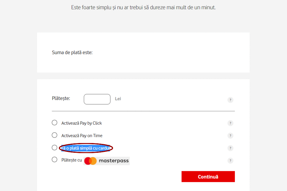 Az üres dobozba írd be az összeget, amennyit fizetni szeretnél, majd válaszd az egyszeri kártyás fizetést (Fă o plată simplă cu cardul).