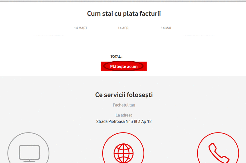 Ha regisztráció után a vodafone.ro oldalán a kis emberre viszed a kurzort, a lenyíló ablakban rákattinthatsz a My Vodafone Fix & Tv-re, itt pedig rögtön megjelenik az, hogy hogy állsz a számláiddal.