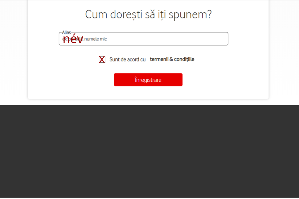 Ezután írd be (bece)neved, vagy bármilyen nevet, amin a továbbiakban szeretnéd, hogy szólítsanak, és pipáld ki a négyzetecskét (ezzel elfogadod a felhasználási feltételeket).
