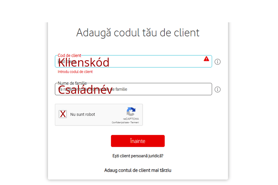 Az új ablakban töltsd ki a kért információkat: az első üres mezőbe a Klienskódot (Cod client) – a számla felső felében középen találhatod meg –, a másodikba a Csaldánevet (Nume de familie) írd, és pipáld ki a négyzetecskét a Nu sunt robot írás előtt.
