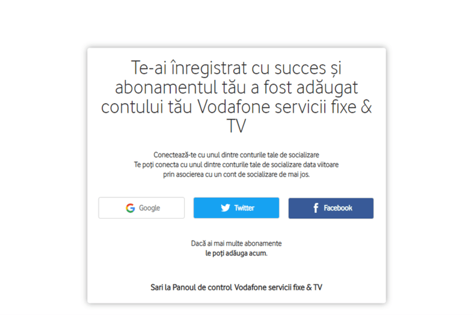 Ezután már ugorhatsz is a kezelőfelületre (Sari la Panoul de control Vodafone servicii fixe & Tv), vagy ha meggondoltad magad, még mindig összekapcsolhatod a Vodafone-fiókod a már meglévő fiókjaid valamelyikével, ha pedig több előfizetésed is van, azt a le poți adăuga acum-ra kattintva adhatod meg.