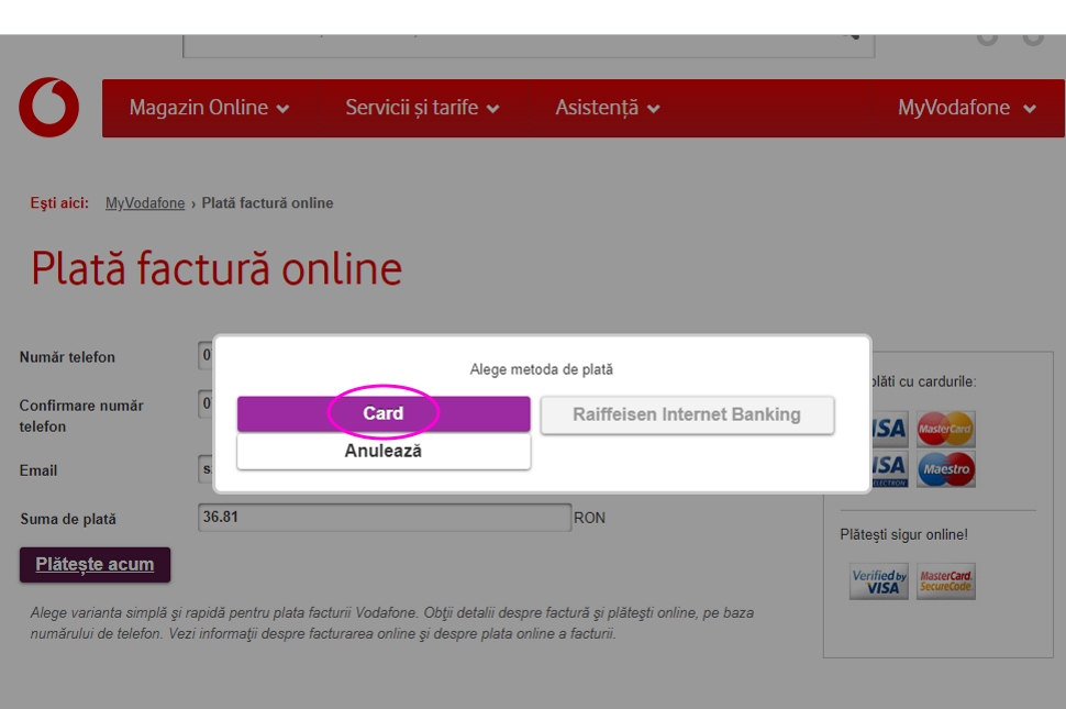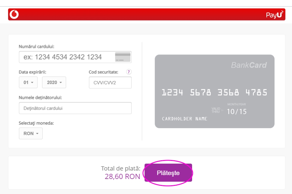 Az első sorba a kártya elején levő 14 jegyű számsort, a másodikba a kártya lejáratának időpontját (hónap, év) kell beírni. Szintén a második sorban,  CCV/CCV2-t tartalmazó keretbe a kártya hátán levő, háromjegyű biztonsági kódot pötyögjük be, ami az aláírás mellett van általában, a harmadik sorba pedig kártya tulajdonosának a nevét gépeljük be, végül válasszuk ki a pénznemet, és nyomjuk meg a Plătește gombot.