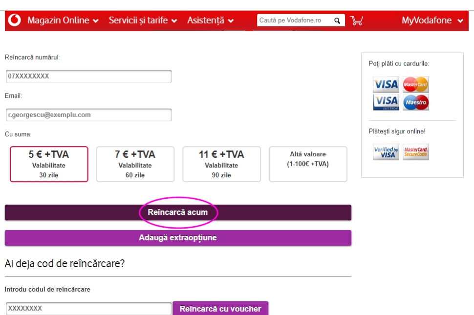 Böngészőnkben látogassunk a www.vodafone.ro oldalra, ahol első lépésként kattintsunk a bekarikázott Reîncarcă o cartelă gombra, vagy kezdjük egyenesen innen.