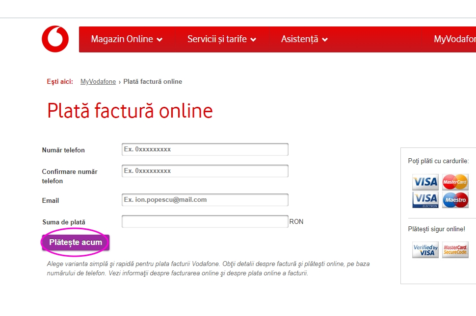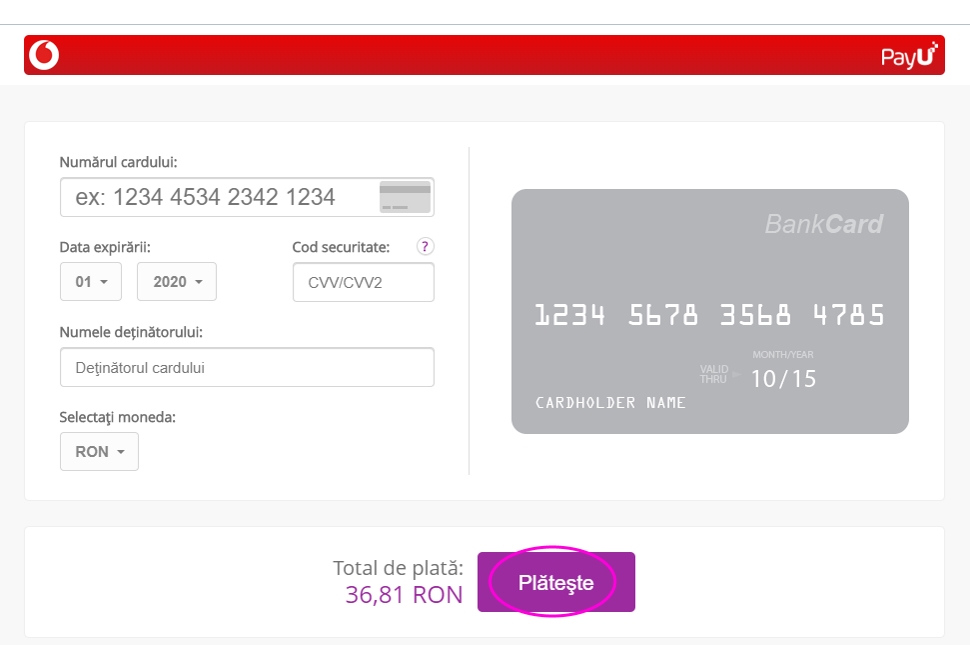 Az első sorba a kártya elején levő 14 jegyű számsort, a másodikba a kártya lejáratának időpontját (hónap, év) kell beírni. Szintén a második sorban, CCV/CCV2-t tartalmazó keretbe a kártya hátán levő, háromjegyű biztonsági kódot pötyögjük be, ami az aláírás mellett van általában, a harmadik sorba pedig kártya tulajdonosának a nevét gépeljük be, végül válasszuk ki a pénznemet, és nyomjuk meg a Plătește gombot.