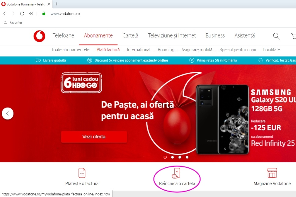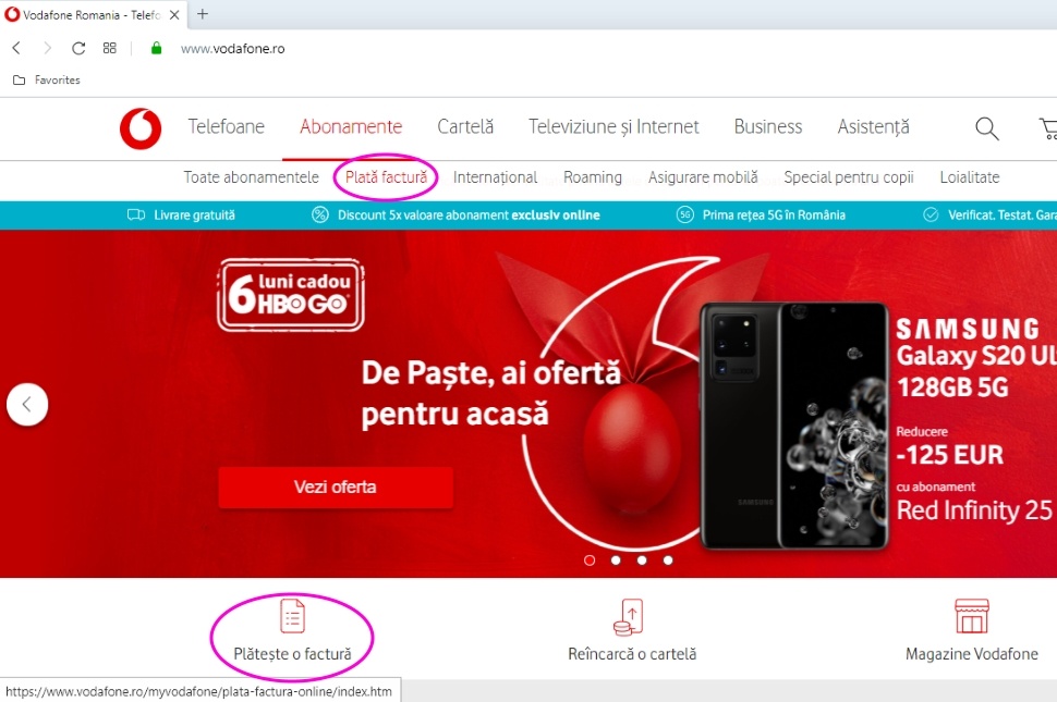 Ebben az esetben is a www.vodafone.ro kezdőlapjáról indulunk, ahol vagy vidd az egered a fenti menüsorban az Abonamente gombra, és a lenyíló lehetőségek közül válaszd a Plată factură gombot, vagy egyszerűen kattints a lenti bekarikázott Plătește o factură írásra.