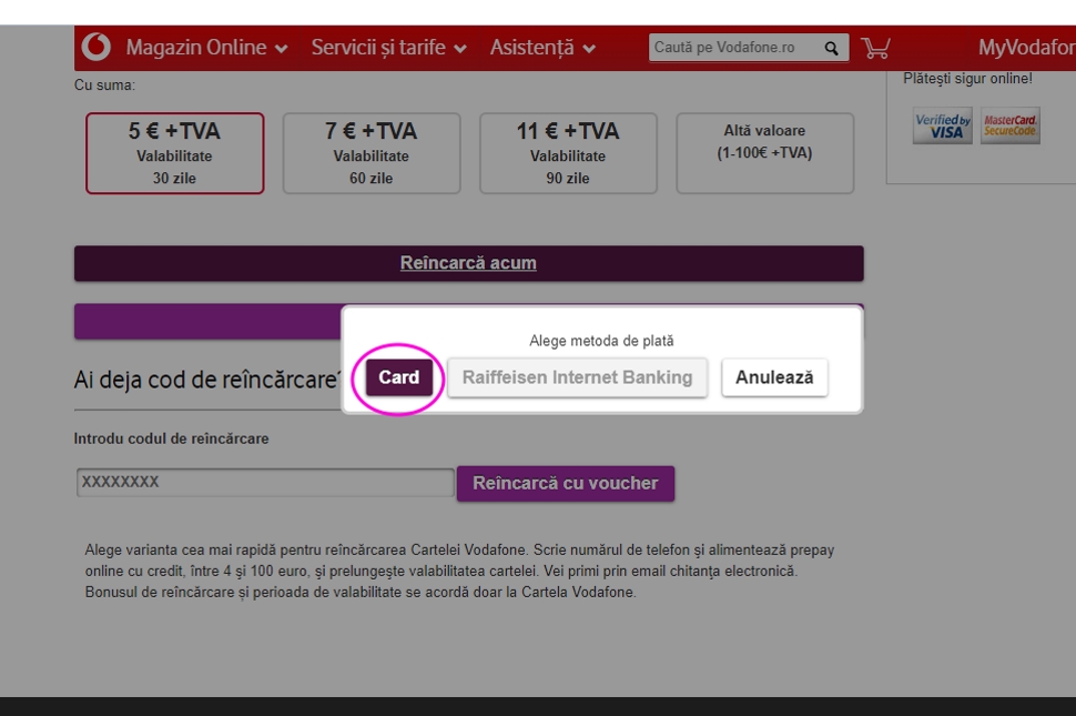 Böngészőnkben látogassunk a www.vodafone.ro oldalra, ahol első lépésként kattintsunk a bekarikázott Reîncarcă o cartelă gombra, vagy kezdjük egyenesen innen.