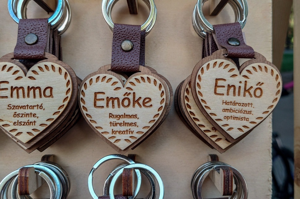 Bár egészen a játszótérig kell a tömegen átverekedned magad, de ha odaérsz, kis fából készült, névreszóló kulcstartókat vásárolhatsz.