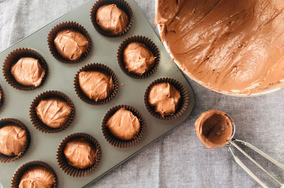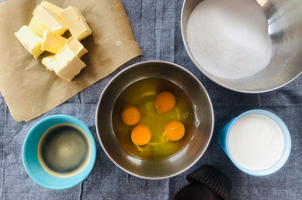 A vajat a cukorral kihabosítjuk. Egyenként hozzáadjuk a tojásokat. A száraz hozzávalókat elkeverjük, és a tejszínben elvegyített kávéval felváltva a tojásos masszához adjuk. Ha szép sima a massza, muffinpapírral kibélelt tepsibe adagoljuk, és 180 fokos sütőben 20-25 perc alatt megsütjük.
