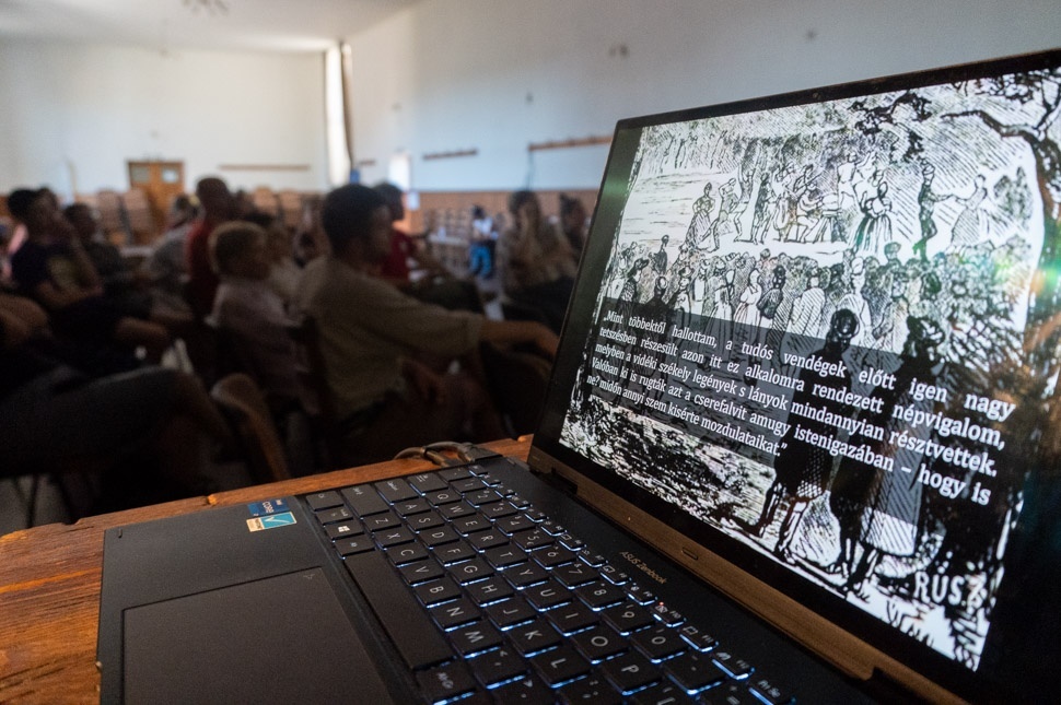 Szóval „egy gazdag, sokszínű adatbázisról van szó” – nyomatékosította a szerző –, amelyből a néptánctábor kedvéért Korondfürdő zenei felhozatalával, zenekaraival kapcsolatos információkat szemlézett. Ehhez annyit kell tennünk, hogy az online elérhető pdf-dokumentum keresőjébe beírjuk a megfelelő kulcsszót (pl. „zene”, „zenekar”, „Musik”) és máris megjelennek a találatok – mutatta be Alpár az egyszerű műveletet, ami más érdeklődési körök esetében is alkalmazható.