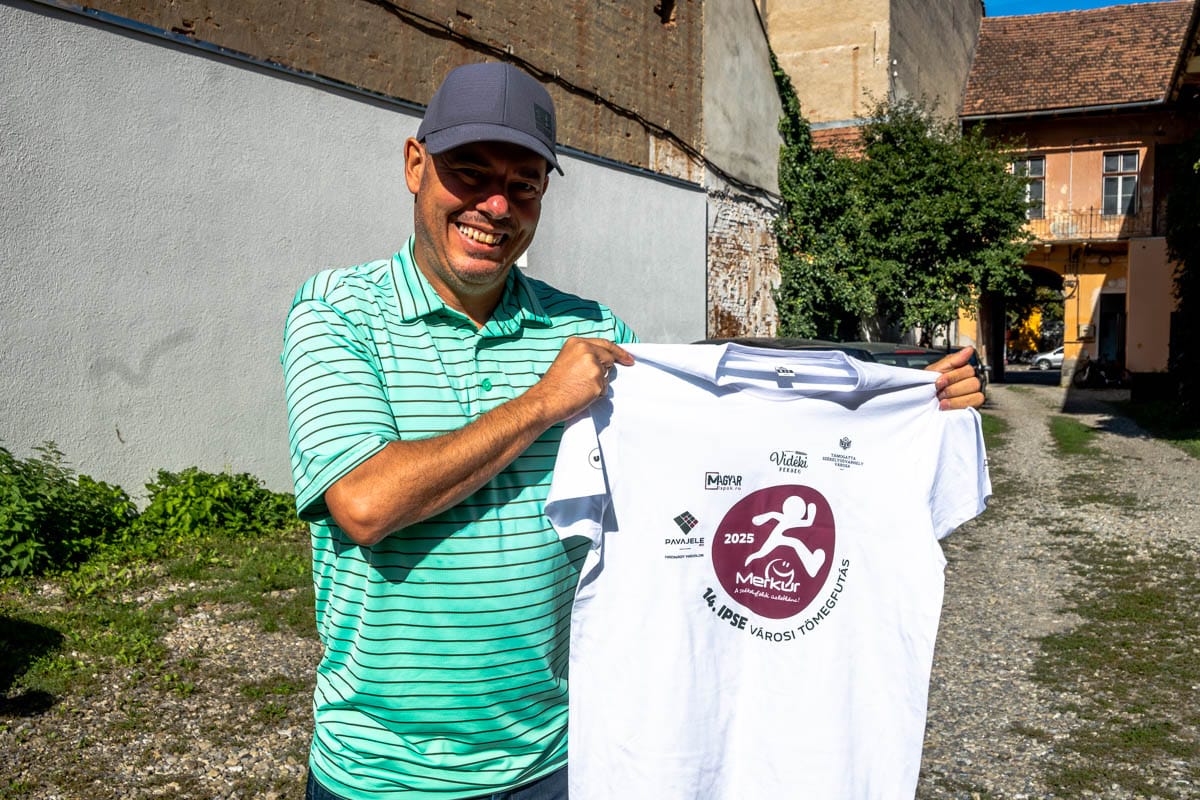 És Zsolt villant. Na, nem kell rosszra gondolni, csak a kérésemre elhozta a pólót, amelyben idén szeptember 27-én, tíz órától elstartolnak a résztvevők futók, legalább kétezren a regisztrálók közül, regisztrálási sorrendben.